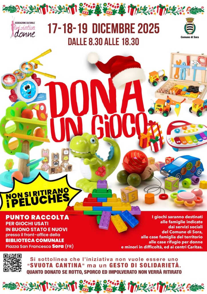 Il Natale a Sora rinnova uno dei suoi appuntamenti più sentiti e generosi: torna anche quest’anno l’iniziativa solidale “Dona un gioco”, promossa dall’associazione culturale no profit Iniziativa Donne. Un invito semplice ma dal grande valore umano: regalare un sorriso ai bambini che vivono situazioni di difficoltà attraverso la donazione di giochi nuovi o in buone condizioni.