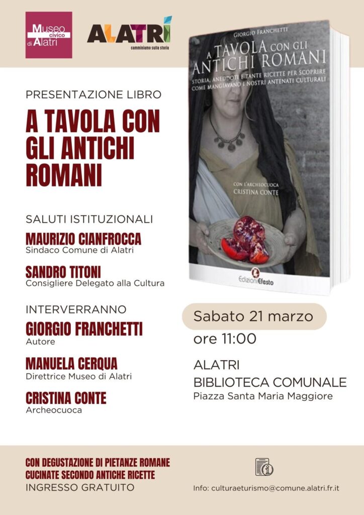 Domani, sabato 21 marzo alle ore 11.00, presso la Biblioteca Comunale di Alatri in Piazza Santa Maria Maggiore, si terrà la presentazione del volume “A tavola con gli antichi Romani” dell’archeologo e divulgatore storico Giorgio Franchetti.