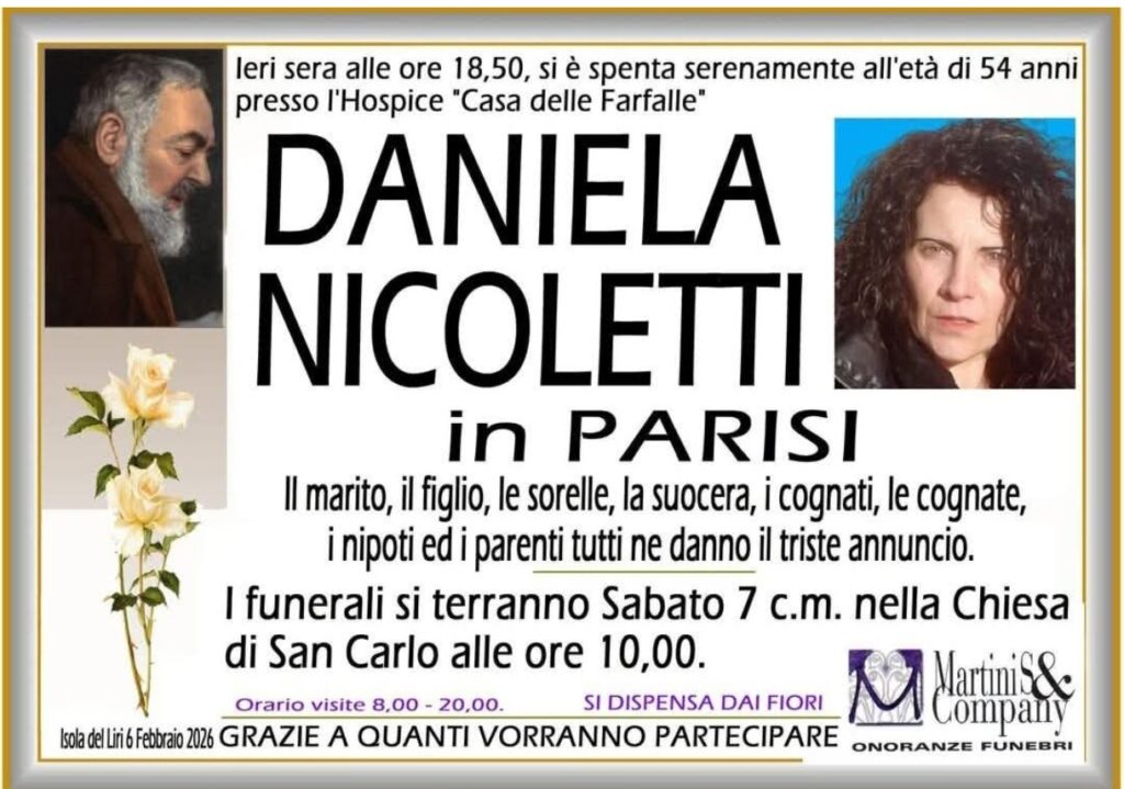 Tantissimi i messaggi di cordoglio postati sui social, la comunità si stringe affettuosamente intorno al figlio Matteo, al marito, originario della vicina città di Sora, alle sorelle, ai parenti. I funerali di Daniela Nicoletti si terranno nella mattinata di domani, sabato 7 febbraio, alle ore 10:00, presso la chiesa di San Carlo, nell’omonimo quartiere ad Isola del Liri. La famiglia dispensa dai fiori e ringrazia anticipatamente quanti vorranno unirsi al lutto. Per chi volesse dare l’ultimo saluto alla giovane mamma, la camera ardente presso l’Hospice è aperta dalle ore 08:00 alle 20:00.