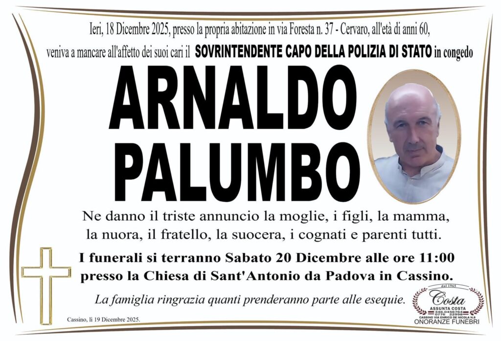 Arnaldo Palumbo aveva indossato la divisa per anni, servendo lo Stato con dedizione, senso del dovere e grande dignità. Nel corso della sua carriera ha prestato servizio presso la Questura di Frosinone e successivamente a Cassino, realtà nelle quali ha lasciato un segno profondo per professionalità e umanità. Proprio a Cassino si era congedato dal servizio, andando in pensione il 1° agosto, dopo una vita spesa al servizio delle istituzioni.