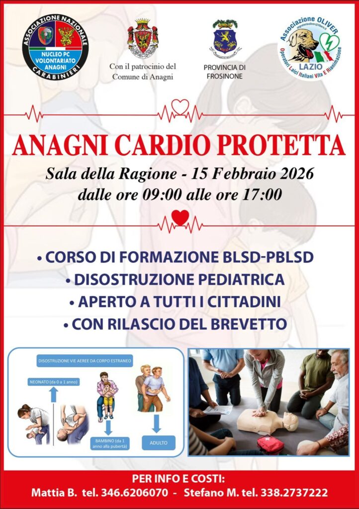 Il 15 febbraio, dalle 09:00 alle 17:00, la Sala della Ragione di Anagni ospiterà una giornata di formazione sul primo soccorso, con corsi BLSD e tecniche di disostruzione pediatrica aperti alla cittadinanza. Un’occasione concreta e preziosa per acquisire competenze pratiche fondamentali e rafforzare la consapevolezza sui temi della prevenzione.