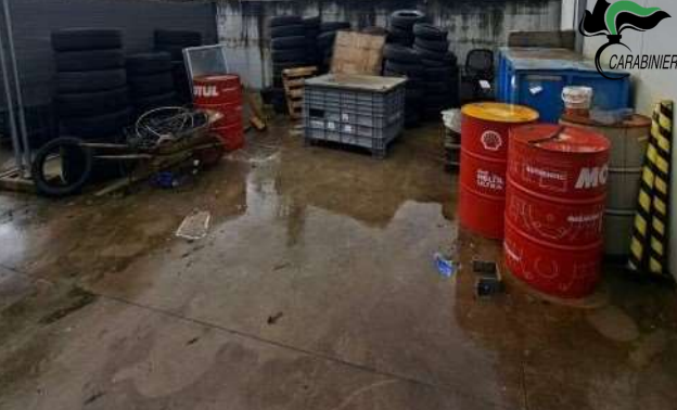 Nel piazzale erano inoltre presenti rifiuti derivanti dalle lavorazioni meccaniche, tra cui parti di motori, fusti di olio esausto, contenitori con batterie per auto dismesse e pneumatici fuori uso.