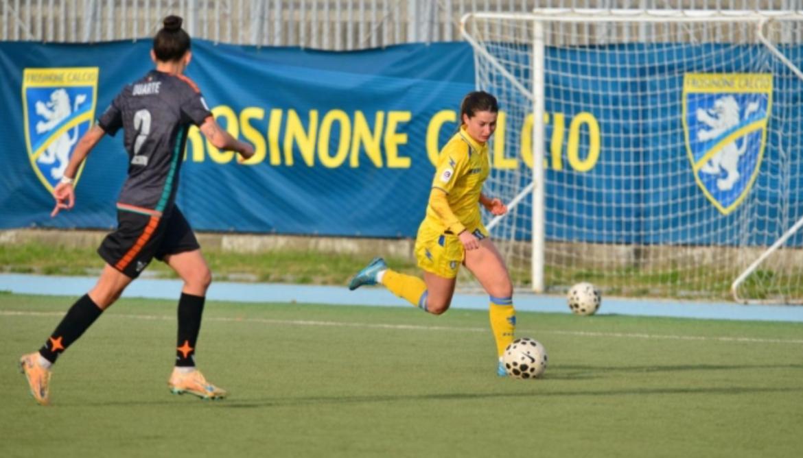 Serie B Femminile – L’undicesima giornata di campionato vede il Frosinone ospitare, alla Città dello Sport di Ferentino, il Venezia. La partita si sviluppa inizialmente su un equilibrio a centrocampo che dura per i primi venti minuti, senza particolari occasioni da una parte e dall’altra. Al ventisettesimo ci prova Nocchi: controlla un pallone prolungato da De Matteis, salta l’avversaria con un sombrero e calcia di prima verso la porta, ma la conclusione è debole e viene bloccata. Il Venezia risponde con una conclusione dalla distanza di Cortesi, facile preda di Nardi. Nel finale arriva una grande occasione per le giallazzurre: Karaivanova salta la difensora sull’out di sinistra e mette al centro un ottimo pallone per Tata, che calcia di prima intenzione, ma il tiro termina tra le braccia di Pucová. L’ultima chance del primo tempo capita a Naydenova, che libera al limite calcia di destro, sfiorando il palo.
