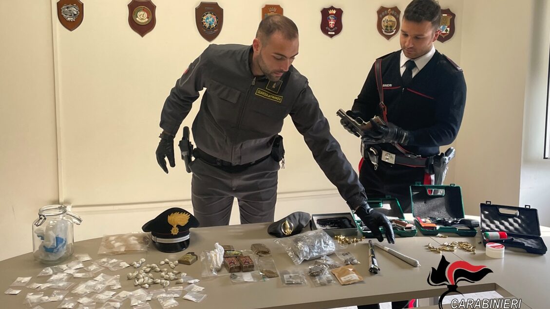 Utilizzando le chiavi in possesso dell’uomo, i militari hanno esteso la perquisizione anche a quella seconda abitazione. Qui, il fiuto del cane antidroga ha portato alla scoperta di circa 170 grammi di cocaina, già suddivisa in 115 dosi di vario peso, cinque panetti di hashish e oltre mezzo chilo di frammenti della stessa sostanza, oltre a una busta sigillata con circa 200 grammi di marijuana. Nel locale erano presenti anche un bilancino di precisione, materiale per il confezionamento e altre pistole scacciacani, per un totale di quattro armi.