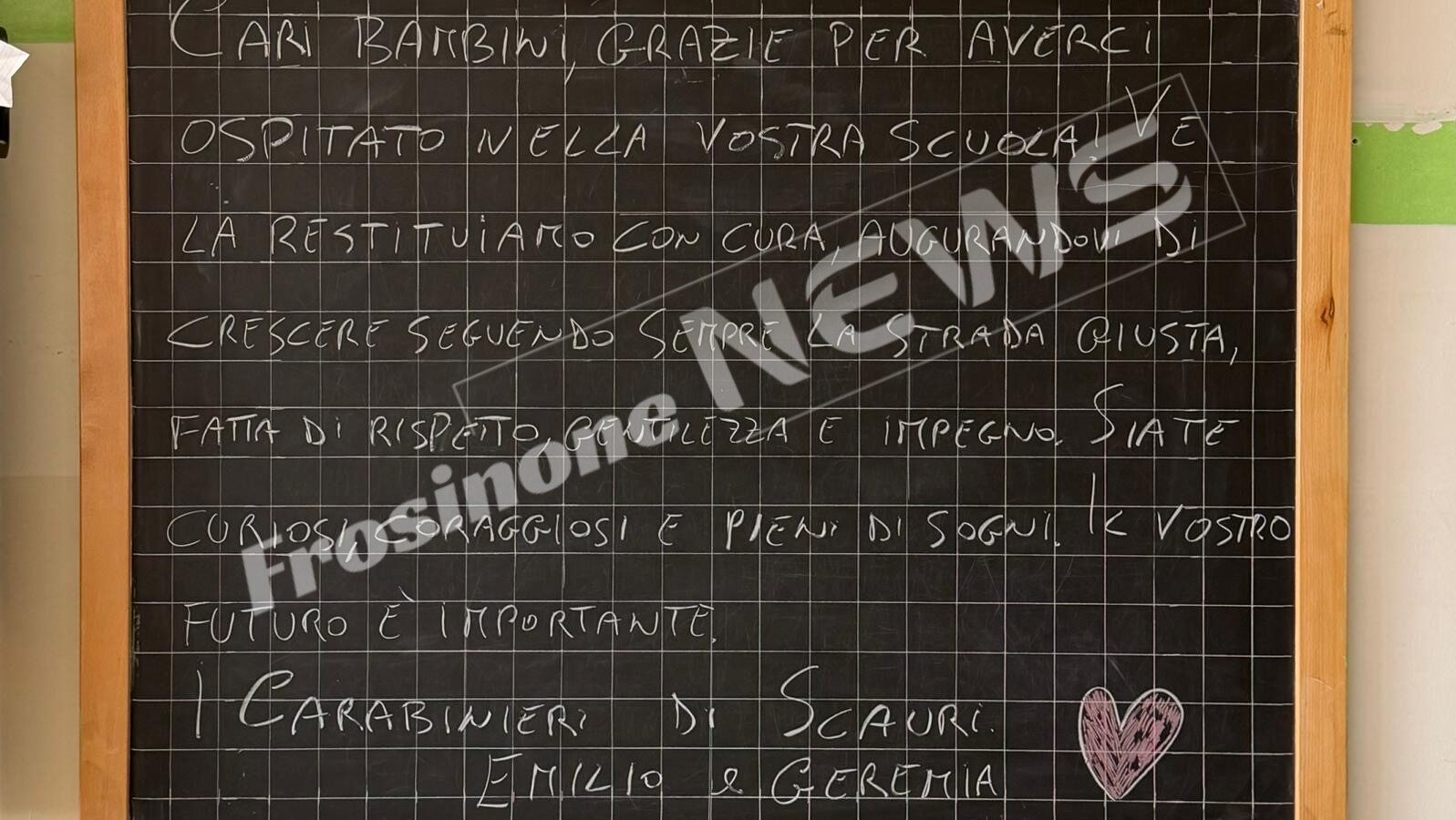 Il messaggio lasciato recita: “Cari bambini, grazie per averci ospitato nella vostra scuola! Ve la restituiamo con cura, augurandovi di crescere seguendo sempre la strada giusta, fatta di rispetto, gentilezza e impegno. Siate curiosi, coraggiosi e pieni di sogni: il vostro futuro è importante. I carabinieri di Scauri, Emilio e Geremia”. Un messaggio che richiama il valore più profondo della presenza delle forze dell’ordine: essere punto di riferimento, soprattutto nei luoghi in cui crescono le nuove generazioni.