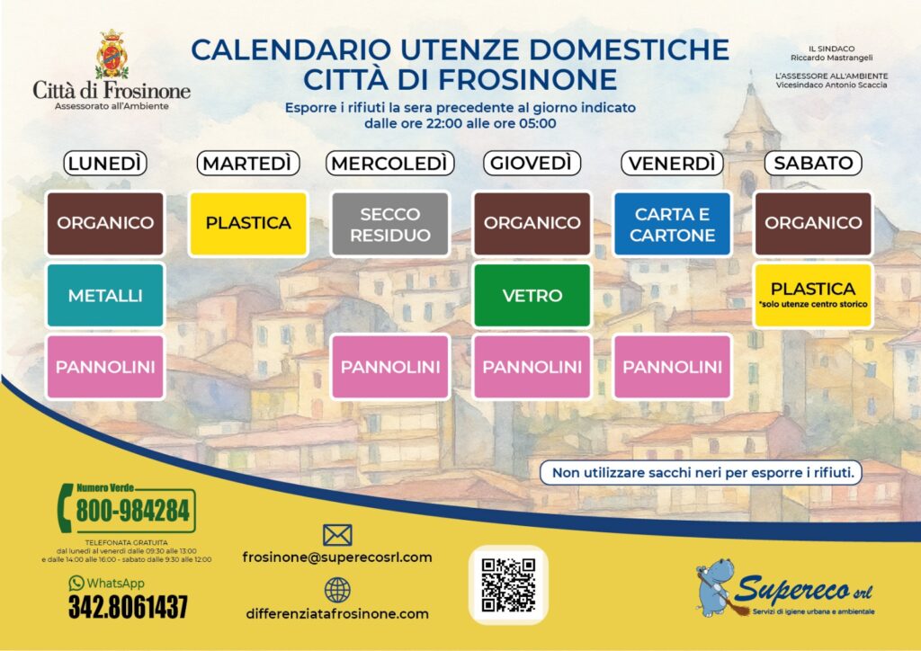 Tra le novità, l’ampliamento degli orari del Centro comunale di raccolta di via della Dogana, aperto lunedì, mercoledì e sabato dalle 9 alle 14 e dalle 15 alle 17; martedì, giovedì e venerdì dalle 9 alle 14 e la prima domenica di ogni mese dalle 9 alle 14 (chiuso nei giorni festivi). Numero verde: 800 – 984284; WhatsApp: 342-8061437. Sito web: differenziatafrosinone.comfrosinone@superecosrl.com.