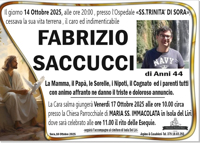 Si terranno nella mattinata di domani, venerdì 17 ottobre, alle ore 11:00, presso la chiesa parrocchiale dedicata a Maria Santissima Immacolata in località Selva di Isola del Liri, i funerali di Fabrizio Saccucci, il 44enne stroncato da un malore fatale nella serata dello scorso martedì, poco prima delle 20:00. Il feretro giungerà in chiesa alle ore 10:00, per consentire l’ultimo saluto al giovane.