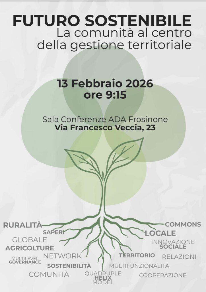 Venerdì 13 febbraio, alle ore 9:15, presso la Sala Conferenza dell’Area Decentrata Agricoltura (ADA) a Frosinone, si terrà l’incontro “Futuro sostenibile: la comunità al centro della gestione territoriale”, promosso dal Network Re.La.Te. – Reti, Laboratori e Territori. L’evento, coordinato da alcune delle principali realtà attive nel tessuto socio‑economico del Lazio Meridionale, tra cui l’Associazione Terre del Basso Lazio, l’Associazione Prociv Centro Italia, la Cooperativa Agricola Sociale Agribombom, l’Associazione OR.T.I.C.A. e la Società Cooperativa 66COOP, vuole essere un momento aperto di confronto, analisi e proposta sui temi chiave per il futuro delle aree interne.