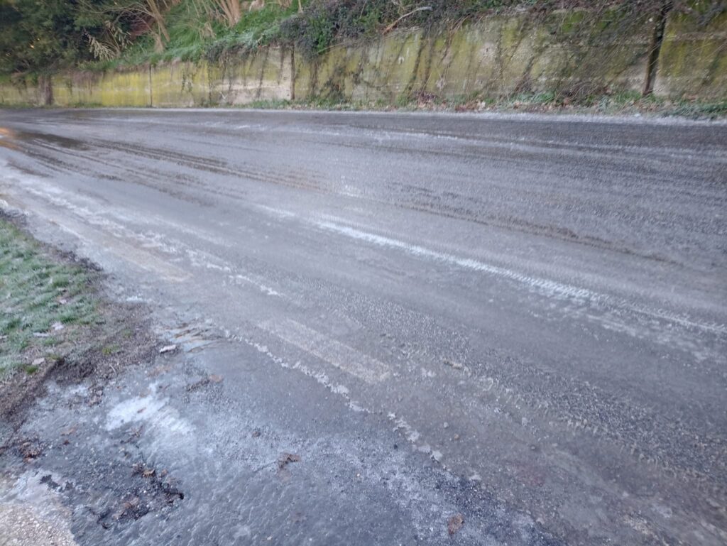 Qui l’asfalto si è trasformato in una lastra di ghiaccio continua, con automobilisti costretti a procedere a passo d’uomo, o a fermarsi del tutto, in condizioni di rischio estremo per la propria e l’altrui incolumità.