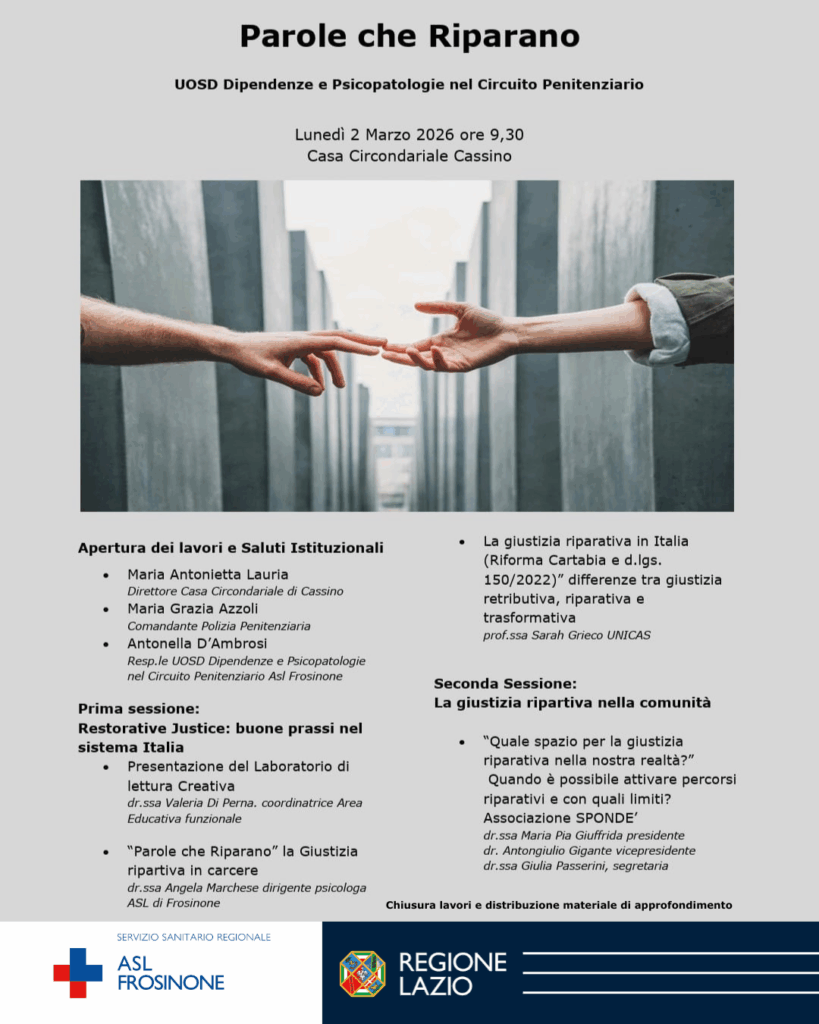 A conclusione del percorso, il 2 marzo 2026 alle ore 9,30 si terrà un “incontro aperto” tra i detenuti ed alcuni esperti del settore giudiziario e sociale, che si confronteranno sull’argomento della Giustizia Riparativa.