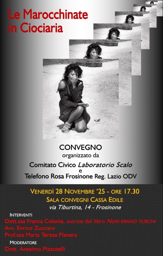 “Le marocchinate in Ciociaria” sarà il tema del convegno convocato per oggi – venerdì 28 novembre – nella sala convegni della Cassa Edile in via Tiburtina, con inizio alle ore 17,30. L’iniziativa è promossa dal Comitato civico Laboratorio Scalo e da Telefono Rosa Frosinone.