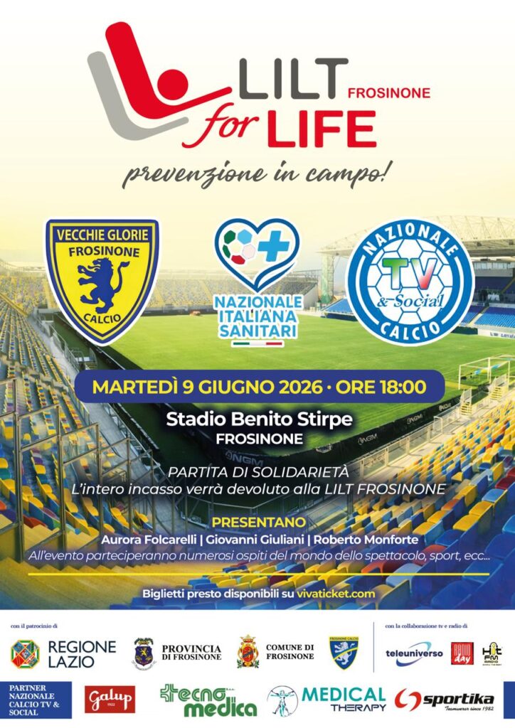 Sport, spettacolo e solidarietà si incontrano a Frosinone per una serata speciale all’insegna della prevenzione. Martedì 9 giugno 2026, alle ore 18.00, lo Stadio Benito Stirpe di Frosinone ospiterà “LILT for Life – Prevenzione in campo”, una grande partita di beneficenza organizzata per sostenere la Lega Italiana per la Lotta contro i Tumori – sezione di Frosinone.