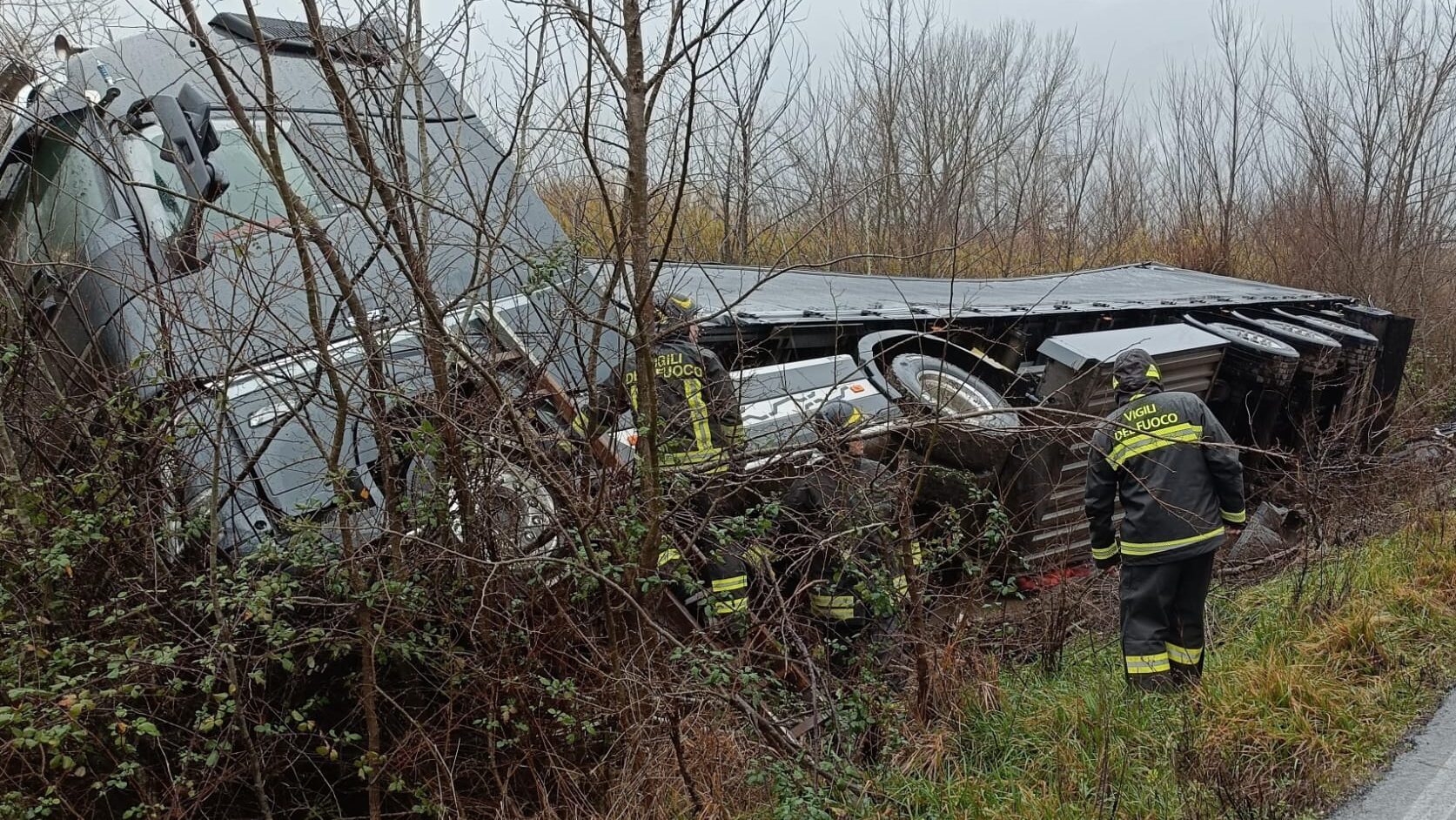 Un bilico e una vettura sono finiti in un fossato. Sul posto i Vigili del Fuoco unitamente ai Carabinieri e all'Ares 118