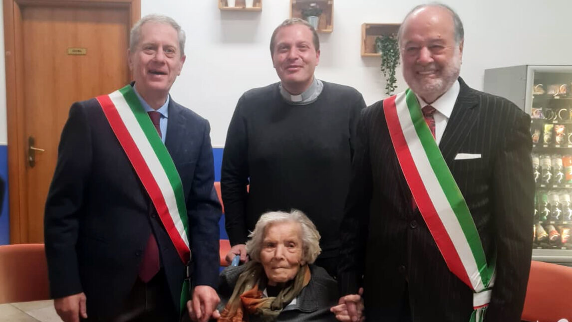 I due sindaci hanno omaggiato la centenaria con fiori e parole di stima, mentre il sindaco Germani ha consegnato anche una pergamena ricordo e una copia autentica dell’atto di nascita.