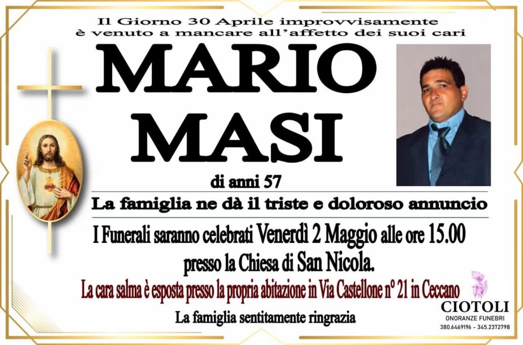 Fissata la data dell’ultimo saluto: i funerali del 57enne saranno celebrati venerdì 2 maggio, alle ore 15 presso la chiesa di San Nicola. Le esequie saranno curate dall’agenzia funebre Ciotoli.