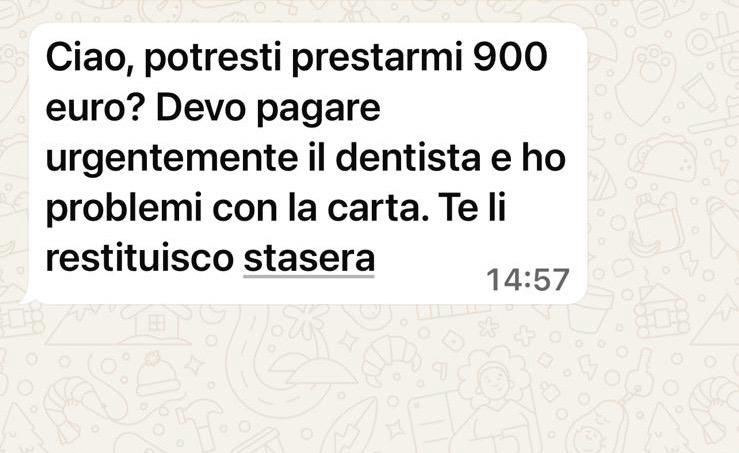 “Ciao, potresti prestarmi 900 euro? Devo pagare urgentemente il dentista e ho problemi con la carta. Te li restituisco stasera”.