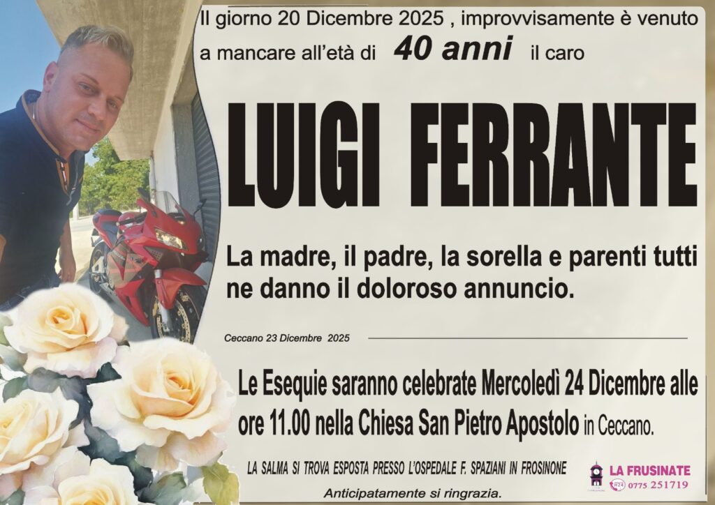 Dopo l’esame autoptico eseguito nella giornata di ieri, la salma di Luigi Ferrante è stata restituita alla famiglia. Le esequie si terranno a Ceccano domani, mercoledì 24 dicembre, alle ore 11, nella Chiesa San Pietro Apostolo, in un clima di profondo dolore e sgomento per una tragedia che ha colpito duramente l’intero territorio. La salma si trova esposta all’obitorio dello Spaziani.