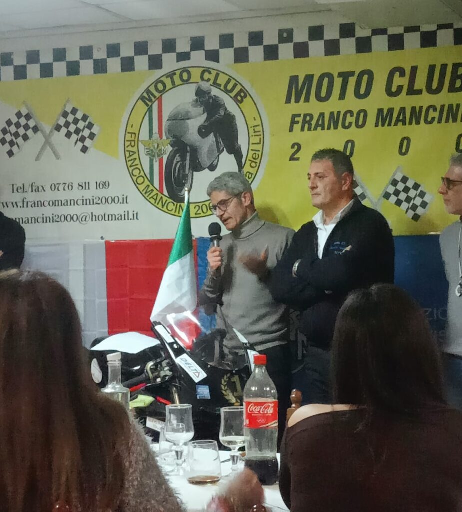 È seguita quindi, la premiazione di tutti i piloti che nel 2025 hanno corso con i coloro del sodalizio isolano, particolarmente coinvolgente la premiazione del pilota Domenico Paniccia, che ha conquistato il titolo di campione italiano e che è stato omaggiato dal M.C., della licenza agonistica 2026. È seguita poi la consegna dell’importante “Premio Mimmantonio” nel ricordo di un caro socio, che tanto ha dato al M.C. Franco Mancini 2000. Il Premio istituito dal M.C. e dalla famiglia Lorini, quest’anno è stato ad appannaggio del Sig Tommaso Raponi, capo tecnico del team Aruba che ha conquistato di titolo di Vice Campione del Mondo con il pilota Nicolò Bulega, il “Premio Mimmantonio” è stato consegnato dal Dott. Giovanni Caschera, nipote del caro estinto. Era prevista anche la consegna di un premio speciale da parte dell’Amm.ne Com.le di Castelliri al Sig. Andrea Saccucci, tecnico del team Aruba per essersi laureato Campione del Mondo nella classe MotoE, ma purtroppo il Sindaco di Castelliri, come spiegato dal suo collega Massimiliano Quadrini, non è potuto intervenire a causa di un triste evento verificatosi nel suo comune e che non gli ha permesso di allontanarsi, pertanto detta premiazione avrà luogo nella sala consiliare del Comune di Castelliri. A fine serata infine, c’è stata la riffa sociale con premi offerti dalle tante attività, che sempre supportano le iniziative del M.C. Franco Mancini 2000