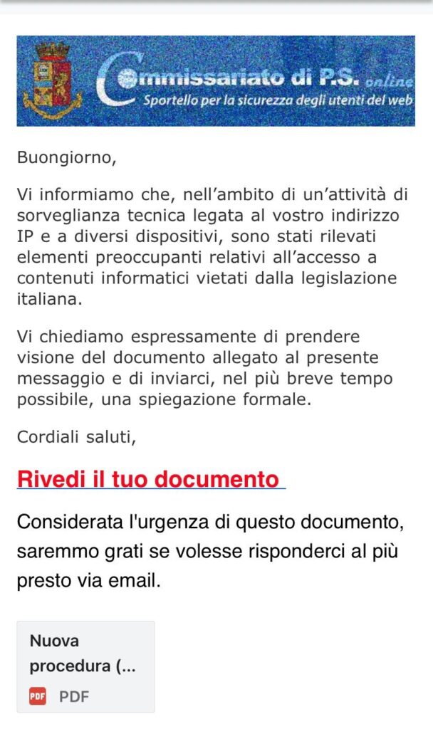 Questo l’oggetto della presunta notifica, che informa il destinatario che sono stati “rilevati elementi preoccupanti relativi all’accesso a contenuti informatici vietati dalla legislazione italiana”. L’urgenza e la fretta inducono la vittima del raggiro a non dedicare il giusto tempo e la dovuta attenzione alla comunicazione ricevuta, favorendo la riuscita della truffa.