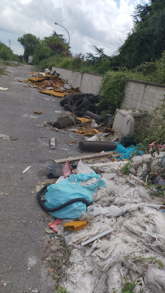 Mentre si moltiplicano i progetti “green” da milioni di euro per la Valle del Sacco, la realtà quotidiana racconta tutt’altro. Lungo la strada ASI, accanto al muro di cinta dell’ex stabilimento Siporex, si estende una vera e propria discarica abusiva: materassi, frigoriferi, pneumatici fuori uso, pezzi di auto e rifiuti di ogni genere giacciono indisturbati da anni.