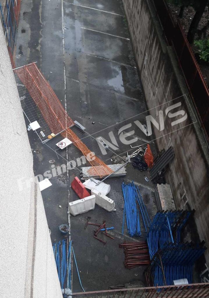 Gli stessi residenti segnalano ora l’ennesimo problema: le avverse condizioni meteorologiche della scorsa settimana – oltre a far scorrere l’acqua piovana sui muri degli appartamenti costringendo chi ci vive con secchi, bacinelle ed asciugamani a tamponare le pareti – hanno buttato a terra il materiale edile abbandonato nel cortile del complesso “residenziale”, i pannelli della recinzione, paletti di ferro e quant’altro. In questo modo bambini, adulti ed anziani sono esposti al serio rischio di inciampare, essere schiacciati dai cavalletti per i ponteggi o anche peggio.