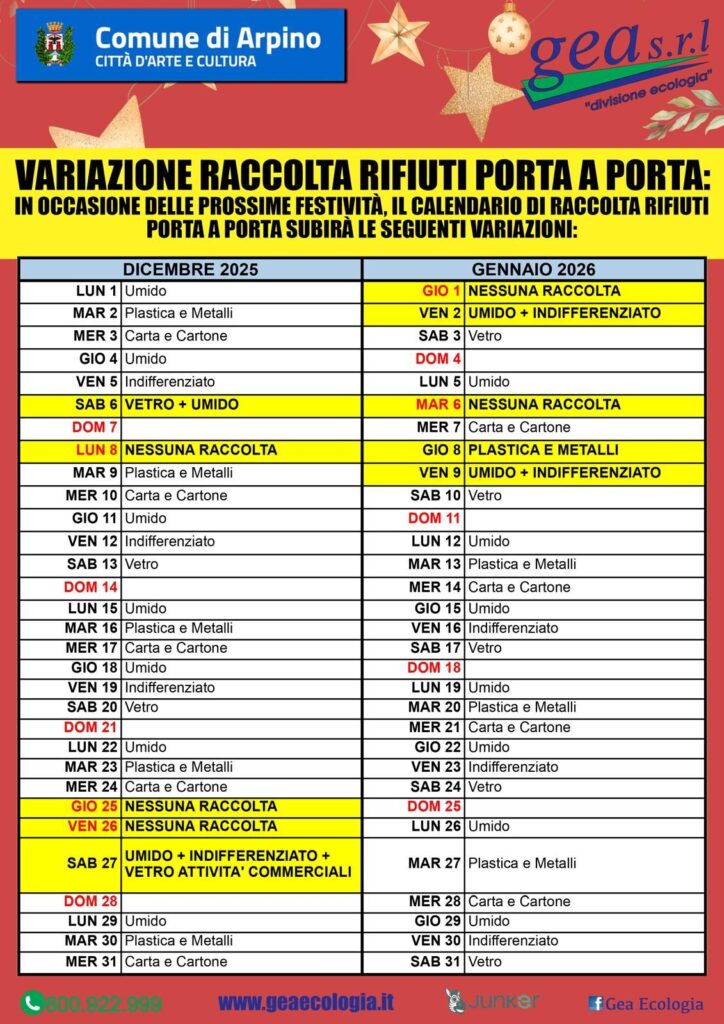 In occasione delle Festività Natalizie sono inderogabili le variazioni al calendario per la raccolta differenziata porta a porta. Relativamente al territorio di Arpino, l’Amministrazione Comunale ha divulgato anzitempo tutte le informazioni utili sui social, invitando anche la stampa a diramare i cambiamenti. Si comunica che le modifiche riguarderanno, ovviamente, i giorni festivi: nelle nottate di mercoledì 24 su giovedì 25 e poi di giovedì 25 su venerdì 26 non verrà effettuato alcun ritiro. La sera di venerdì 26 i residenti potranno metter fuori i rispettivi ingressi sia la frazione dell’umido che quella dell’indifferenziato; per le attività commerciali anche il vetro.
