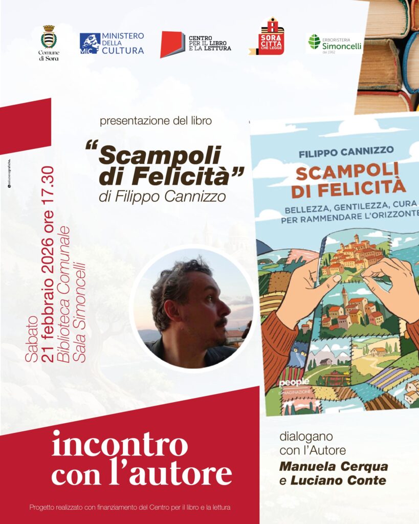 Domani, sabato 21 febbraio 2026, alle ore 17:30, a Sora, presso la “Sala V. Simoncelli” della Biblioteca Comunale di Sora (in Piazza San Francesco), si terrà la presentazione del nuovo libro del filosofo Filippo Cannizzo, “Scampoli di felicità: bellezza, gentilezza, cura per rammendare l’orizzonte”.
