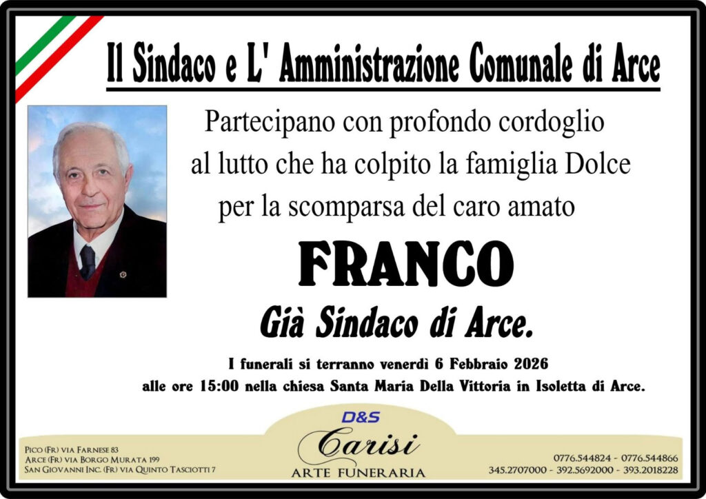 Così il Sindaco Luigi Germani e l’Amministrazione comunale di Arce esprimono il personale cordoglio nel ricordare di Franco Dolce: «Amministratore serio e appassionato, ha dedicato anni di impegno al servizio di Arce e, in modo particolare, della sua amata frazione di Isoletta, contribuendo con concretezza alla crescita del paese e alla realizzazione di opere importanti per la collettività. Chi ha lavorato con lui ne ricorda il senso del dovere, il garbo umano e l’amore sincero per la propria terra». Il Sindaco Germani, che condivise con lui l’esperienza amministrativa quando Dolce ricopriva il ruolo di assessore, lo ricorda come una persona leale, capace di ascoltare e di decidere sempre con lo sguardo rivolto al bene comune.