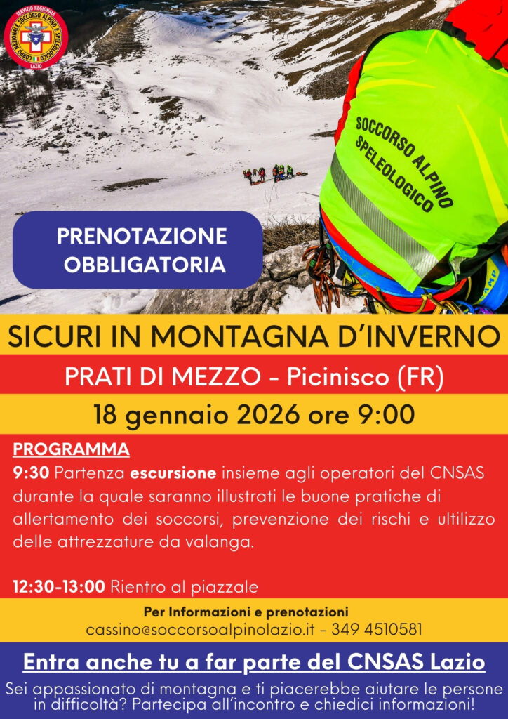 Domenica 18 gennaio torna “Sicuri in Montagna d’Inverno”, la giornata nazionale promossa dal Corpo Nazionale Soccorso Alpino e Speleologico (CNSAS) e dal Club Alpino Italiano (CAI), dedicata alla prevenzione degli incidenti in montagna durante la stagione invernale. L’iniziativa prevede oltre 30 appuntamenti distribuiti su tutto il territorio nazionale.