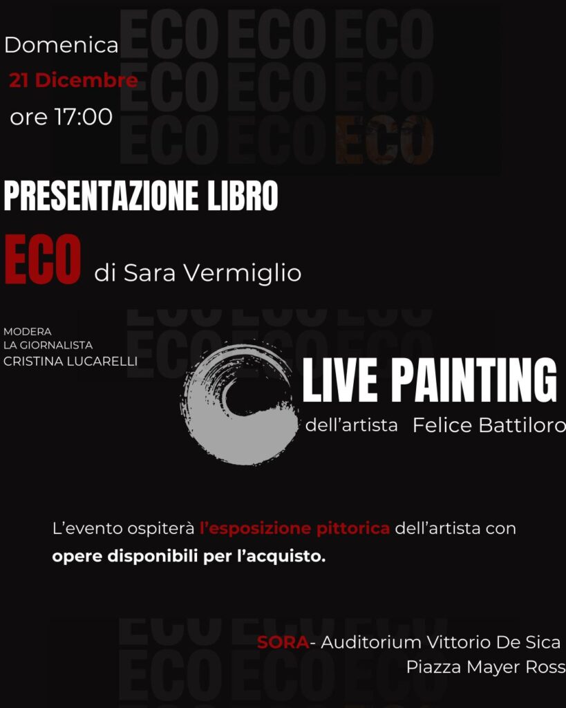 Domenica 21 dicembre, alle ore 17.00, l’Auditorium Vittorio De Sica di Sora (Piazza Mayer Ross) ospiterà la presentazione del libro ECO di Sara Vermiglio, giovane autrice del territorio al suo esordio letterario. Si tratta di un evento culturale che unisce appunto letteratura, arti visive, musica e teatro in un’unica esperienza immersiva e condivisa. A moderare l’incontro sarà la giornalista di Frosinone News Cristina Lucarelli.