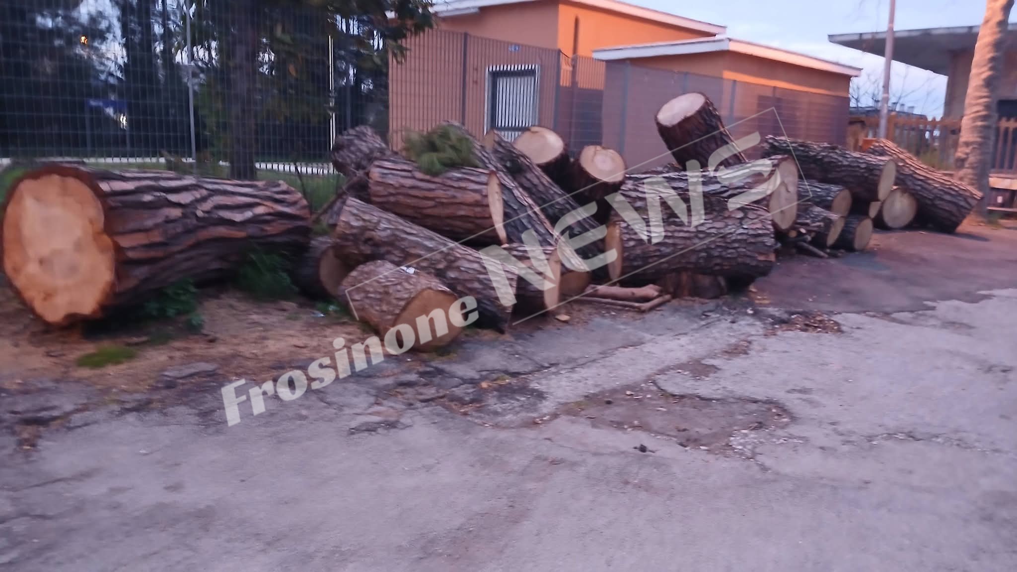 I tronchi dei pini tagliati sono ancora accatastati sul lato dell’ingresso principale della stazione ferroviaria, davanti gli stalli dei mezzi pubblici, già da diversi giorni. Un “mucchio precario” di imponenti pezzi di fusto che, se malauguratamente ruzzolassero, potrebbero provocare danni seri. Senza pensare che uno di questi potrebbe rotolare contro una persona.