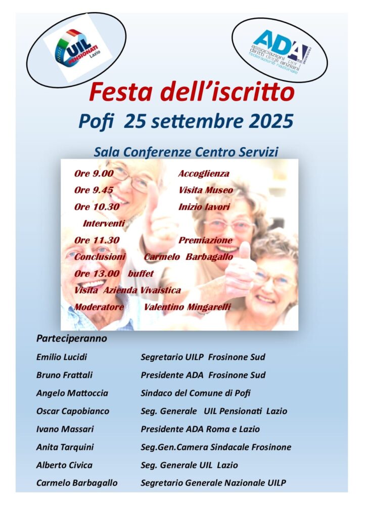 È in programma a Pofi la festa dell’iscritto della UIL Pensionati di Frosinone. Domani, giovedì 25 settembre, presso la Sala Conferenze Centro Servizi, si terrà la cerimonia, con la partecipazione anche dell’ADA, l’associazione per i diritti degli anziani.