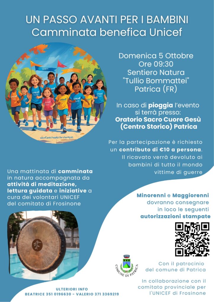 Un sentiero immerso nel verde, voci che raccontano storie, vibrazioni che risuonano tra gli alberi e passi che diventano un gesto di solidarietà. È questo lo spirito della camminata benefica organizzata dal Comitato Provinciale UNICEF di Frosinone, che si terrà sabato 5 ottobre alle ore 9:30 presso il suggestivo Sentiero Natura di Patrica.