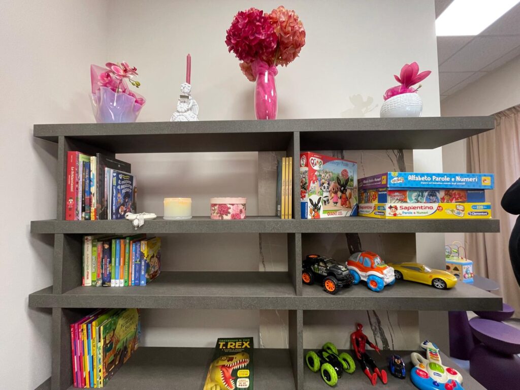 L’arredo – come detto – comprende anche un’area dedicata ai più piccoli, con libri e giocattoli: un supporto prezioso sia quando la vittima arriva con i propri figli, sia quando è necessario ascoltare direttamente un bambino o un adolescente, alla presenza di consulenti specializzati.